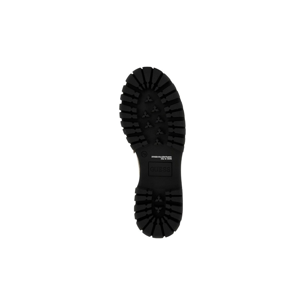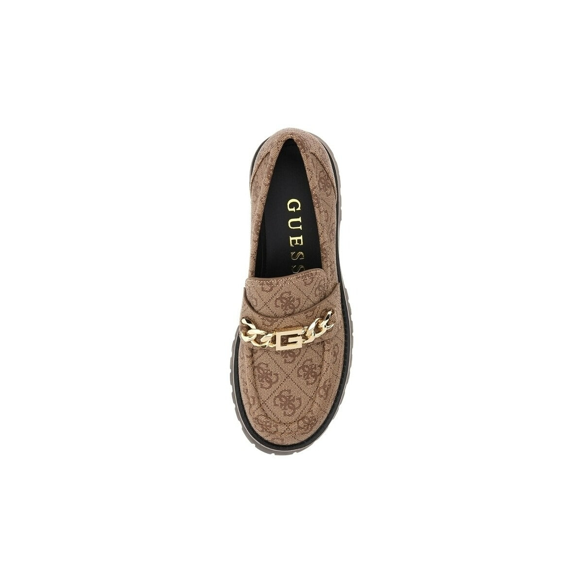 • Loafers with all over embossed 4G logo, round toe & fabric lining. Leather insole, rubber sole & chain with metallic monogram logo Guess on the upper part.