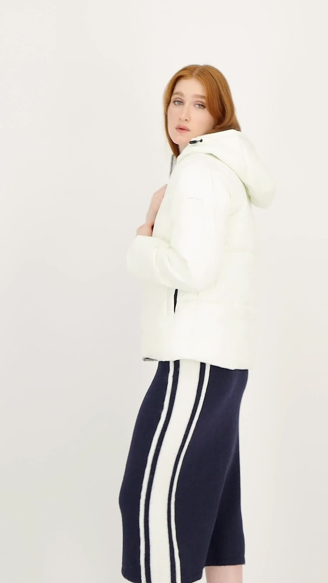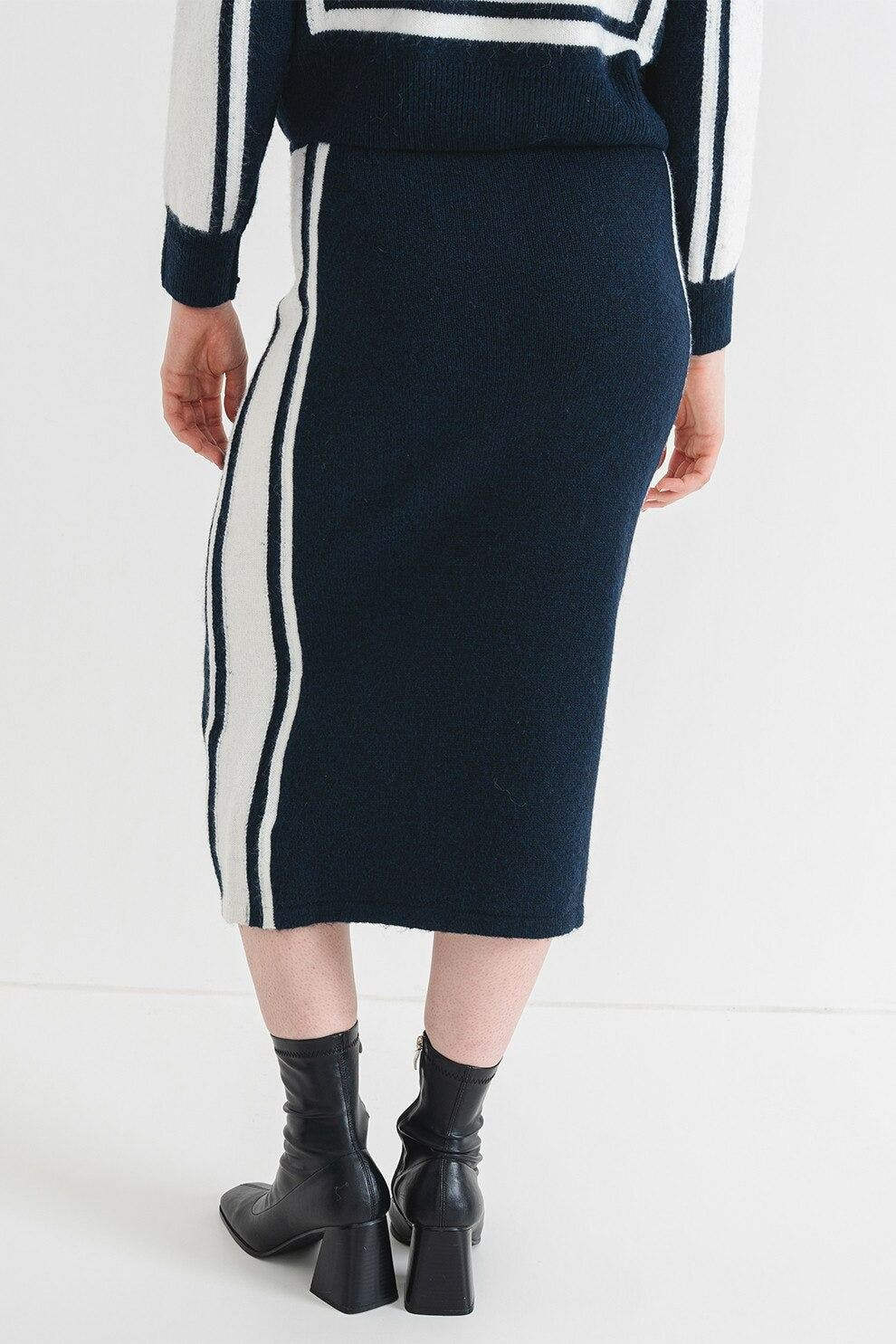 Long knitted skirt with elasticated ribbed waistband, comfortable and easy to combine. It stands out for the contrasting stripes along the sides, which add a modern and sporty touch to the garment.