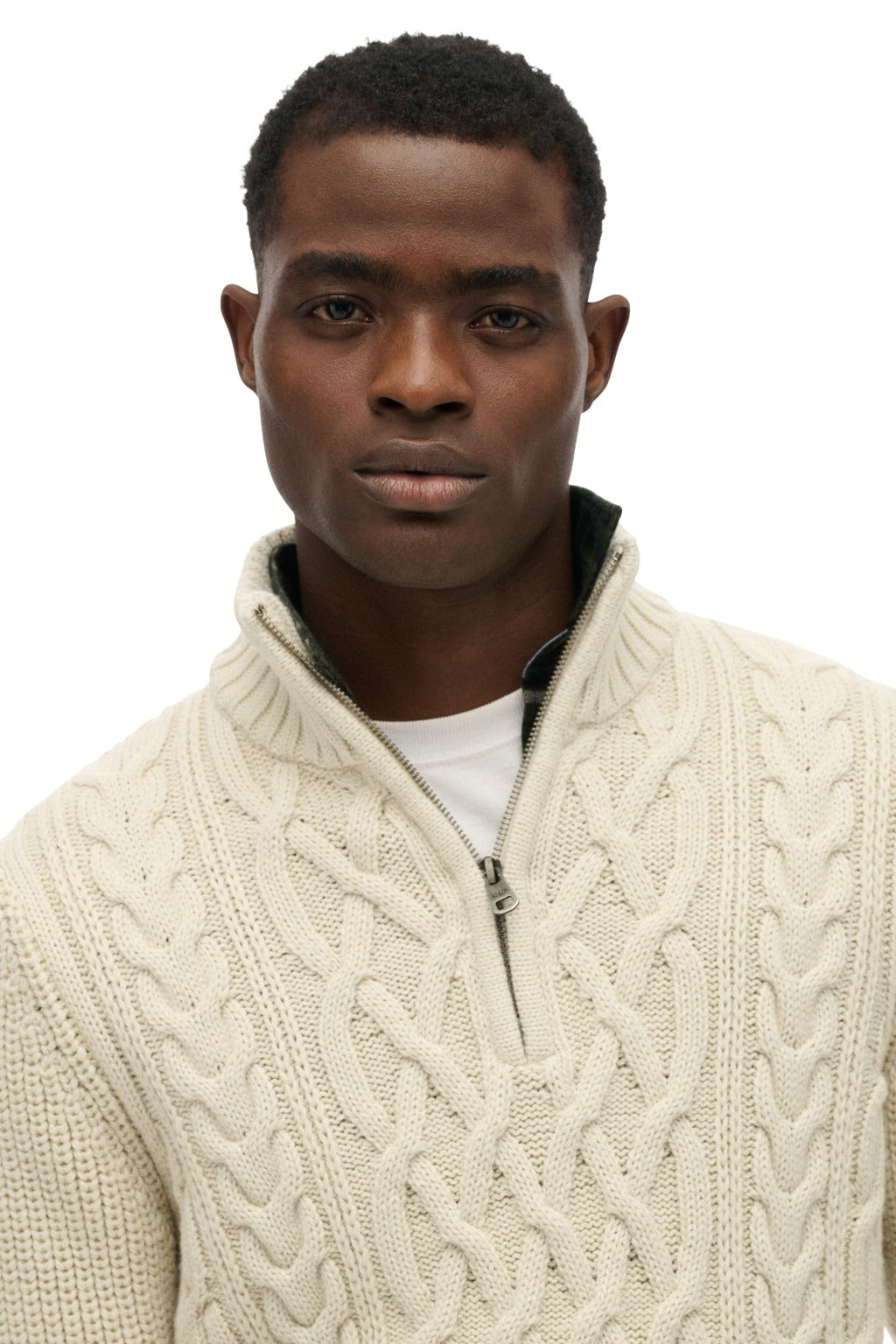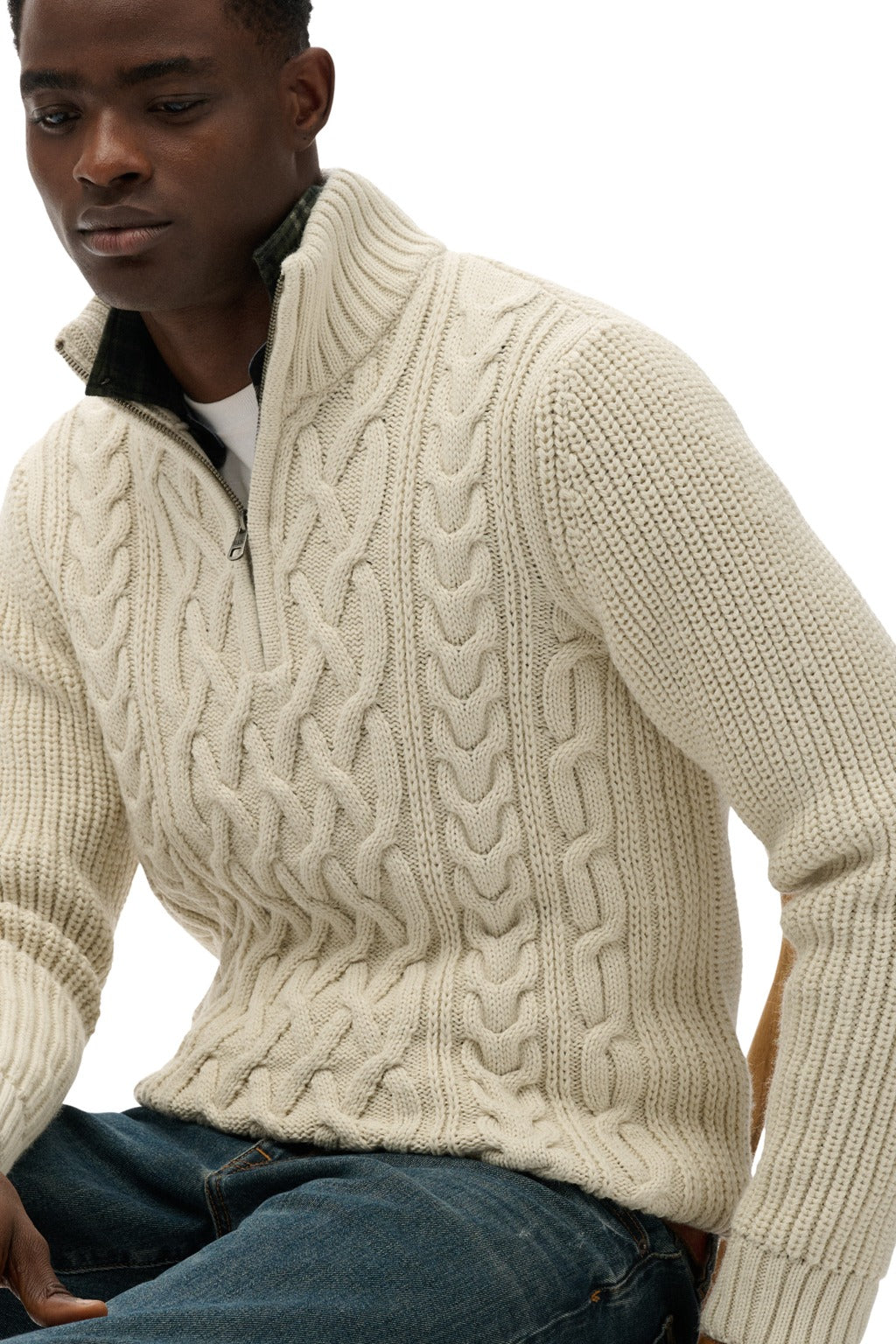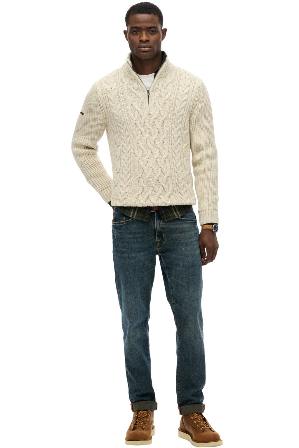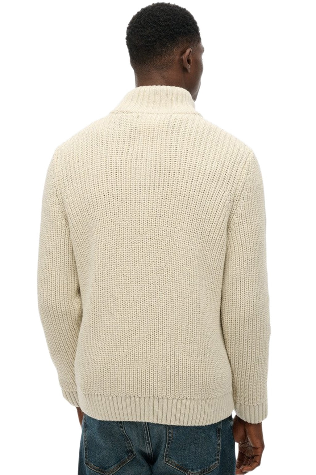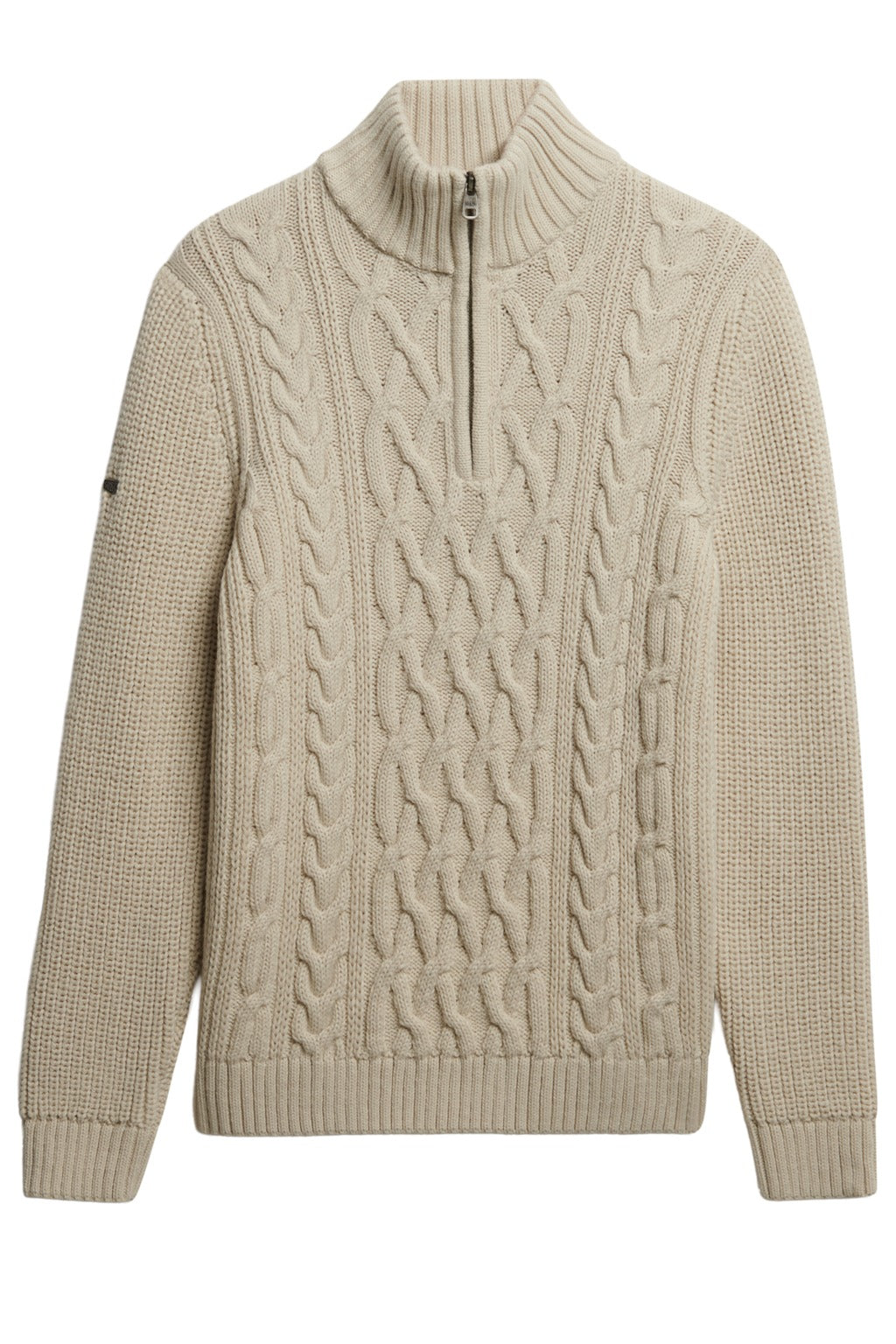 • Knitted long-sleeve, with cable knit, high neck & front closure with half zipper. Ribbing at the cuffs, neck, and hem & metallic Superdry logo on the sleeve.