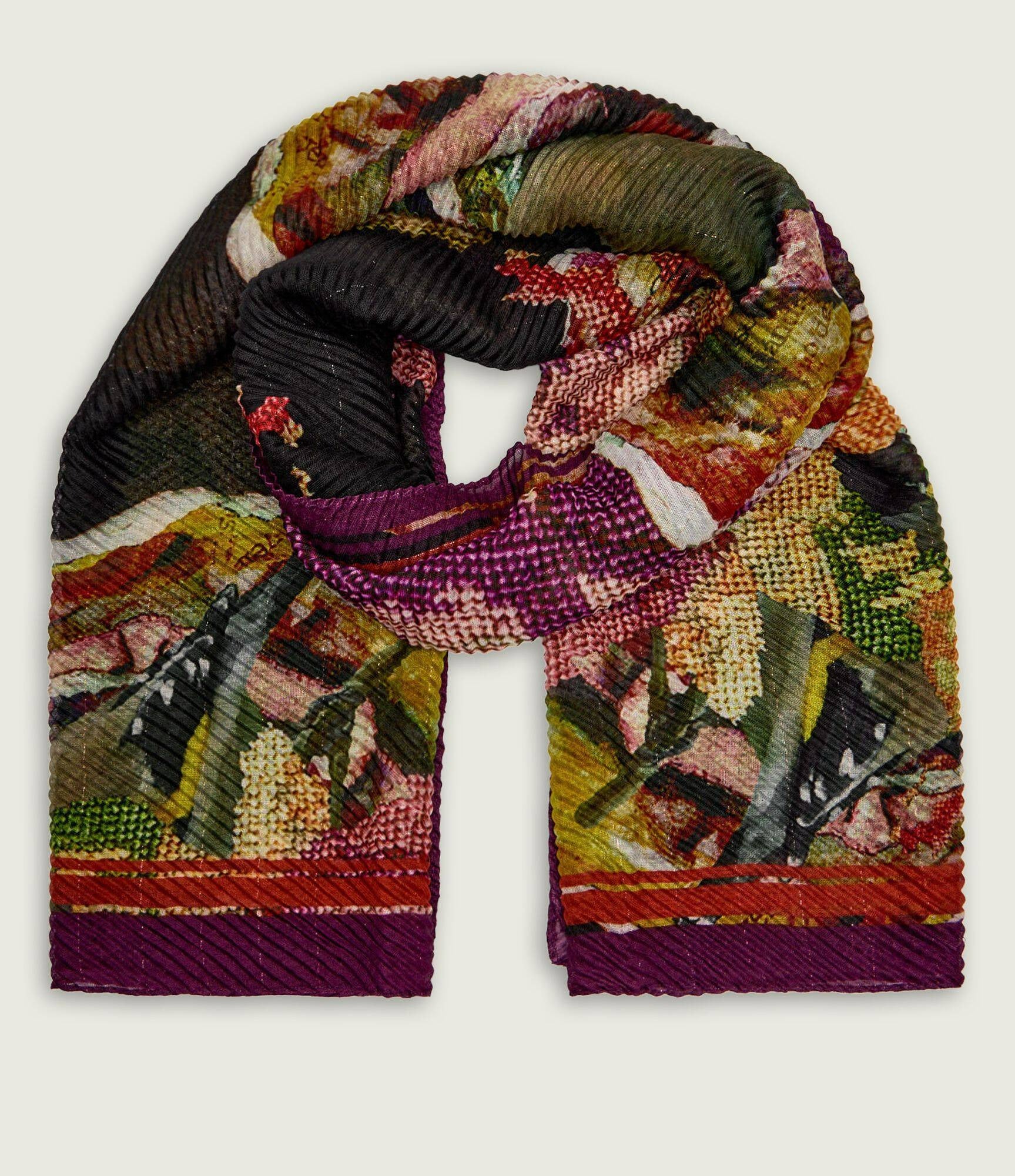 Large rectangular scarf with pleated fabric and a design of flowers and birds designed by Monsieur Christian Lacroix.