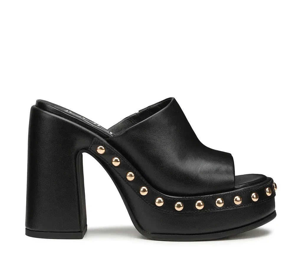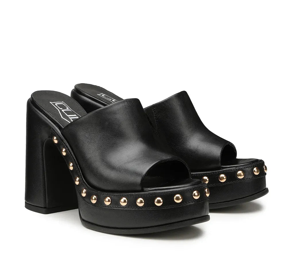 Πέδιλα Μαύρα Bjork από την συλλογή της εταιρείας Cult. Διαθέτουν μαλακό πέλμα και αντιολισθητική σόλα. Φτιαγμένο από μαύρο δέρμα, αυτό το sabot σανδάλι από την Cult θα εμφυσήσει νέα αυτοπεποίθηση στη θηλυκή εμφάνιση. Το μοντέλο έχει μια πληθωρική γοητεία με ψηλή πλατφόρμα, στιβαρό τακούνι και χρυσά σφαιρικά καρφιά που ενισχύουν το τολμηρό στυλ της μάρκας. Ύψος τακουνιού 12 cm.